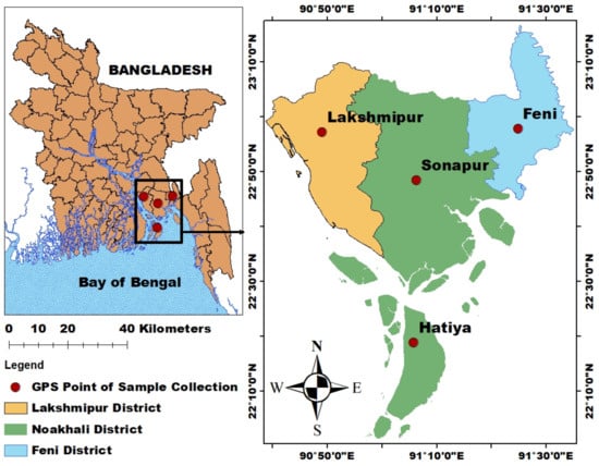 The research was carried out in a subtropical coastal area in Bangladesh, encompassing the regions of Hatiya (22.282405 N, 91.09694 E), Lakhsmipur (22.944674 N, 90.828191 E), Sonapur (22.823557 N, 91.100674 E), and Feni (22.940878 N, 91.406666 E). The study area is grouped into four regions that cover almost all of the important places in Greater Noakhali (Figure 1). The present study area is located in the upper and lower tidal channels of the Meghna River estuary, which is the largest estuarine ecosystem in Bangladesh. The mean temperatures range from 12 °C (December–February) to 34 °C (April–June) with an average annual rainfall of 2980 mm. Southeast monsoon winds with cloudiness, moisture, heavy rainfall, thunderstorms, cyclones, and occasional storm surges characterize the monsoon season (June–October). The sources of pollution in these areas are mainly industrial wastes, agricultural chemicals, fecal waste, oil spills from fishing and passenger boats, and other small industrial effluents. Water quality parameters are included in Table S1.