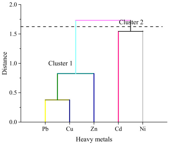 Cluster analysis is mostly used for the presentation of similar groups of the sampling site that have special variability. Similar groups of sites are presented as a group of clusters, and dissimilar sites are plotted in another group of clusters to identify specific areas in terms of contamination [39,40,41]. A hierarchical agglomerative cluster analysis was performed on the normalized data set using Ward’s method with Euclidean distance as a measurement of similarity (Figure 4). The cluster analysis resulted in a dendrogram with a significant cluster at (Dlink/Dmax) × 100 = 20. Two major groups were identified: Pb, Cu, and Zn in cluster 1 and Cd and Ni in cluster 2, demonstrating their close association and possibly indicating the same sources of origin.