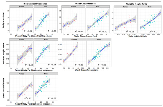 All analyses were conducted with the R 4.0.2 programming language [33]. Visualizations were created with the GGPLOT2 package [34]. For initial data visualization, scatterplots with LOESS curves (an algorithm which uses local weighted regression to fit a smooth curve through points in a scatter plot) were used to show the relationship between the body composition measures stratified by gender. Next, rates of obesity and discordance among measures were created based on recommended cut-off scores. Discordance was defined by the off diagonal of a 2x2 table comparing classification rates (i.e., percent of participants not categorized the same). The strength of the relationship was defined as no relationship (r < 0.25), weak (0.25 < r < 0.5), moderate (0.5 < r < 0.75), and strong (r > 0.75). AFPT total scores were determined with a calculator provided by https://apftscore.com/ (accessed on 8 September 2020); where fail rates (i.e., scoring less than 60 points per event or 180 points total) [32] were calculated. Finally, the relationship between obesity classification (i.e., obese versus not) based on the four body composition measures and measures of fitness and self-rated health were determined using Welch t-tests or chi-square tests, depending on the outcome.