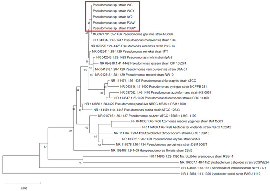 Maximum likelihood phylogenetic tree of Pseudomonas sp. strains based on the 16S rRNA gene. The number at the branches indicates the percentage of occurrences of that branch over 1000 bootstrap replications, with values under 50% hidden. Pseudomonas sp. strains from A. palmeri are circled by the red box.