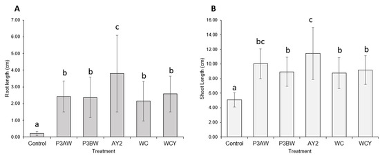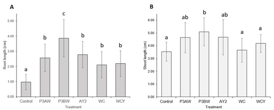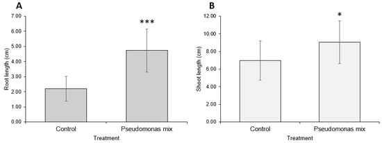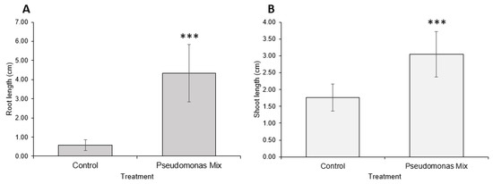 A visual comparison of inoculated and uninoculated carrot seedlings (Figure 6) revealed that inoculated seedlings had noticeably greater root and shoot lengths, greater soil adsorption, and larger cotyledons. Some inoculated seedlings had already grown the first true leaf, while none of the uninoculated seedlings exhibited true leaf growth. Statistical analysis confirmed that inoculation with a mix of Pseudomonas sp. Strains significantly improved the root (Figure 7A) and shoot lengths (Figure 7B) of carrot seedlings. However, the improvement in root length was superior to the improvement in shoot length. In addition, inoculation with a Pseudomonas sp. mix was able to increase the germination rate by 25% (Table A1).