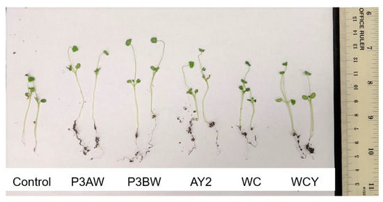A visual comparison of red clover seedlings revealed similar results to the Kentucky bluegrass seedlings (Figure 4). Again, the inoculated seedlings had longer roots and greater soil adsorption compared to the uninoculated control seedlings. Strains AY2, WC, and WCY appeared to confer comparable root-length enhancements, while strains P3AW and P3BW appeared to confer the greatest root-length enhancements. However, it was impossible to visually determine if there were any noticeable enhancements to shoot length.