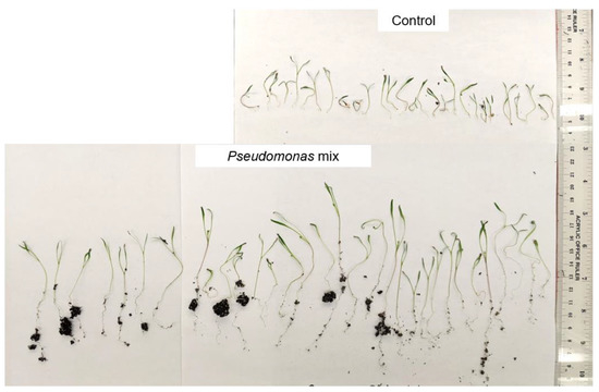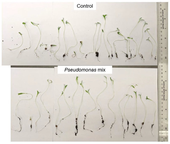 Visual comparison of carrot seedlings inoculated with a Pseudomonas sp. mix. Total number of seedlings germinated = 29, and 31, from top to bottom.