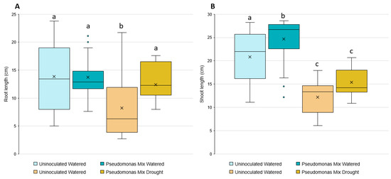 Induction of wheat drought resistance by a mix of Pseudomonas sp. strains. Box and whisker plots are used to show the (A) root and (B) shoot lengths of 3-week-old inoculated and uninoculated wheat seedlings in the presence or absence of drought stress. Blue colored bars represent seedlings grown in irrigated conditions. Yellow bars represent seedlings grown in drought conditions. Boxes encompass the interquartile range (Q1–Q3), whiskers outline the minimum and maximum data points. Xs inside boxes indicate the mean, dots outside the whiskers indicate outliers. Different letters represent significant differences among treatments according to Tukey’s HSD test (p ≤ 0.05).