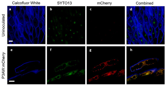Validation of confocal microscopy as a method to track P3AW:mCherry in clover cells. (a–d) Sloughed-off root cells of uninoculated plants. (e–g) Sloughed-off root cells of P3AW:mCherry-inoculated plants. (a,e) Fluorescence of Calcofluor-White-stained cell walls using the 405 nm laser. (b,f) Fluorescence SYTO-13-stained DNA using the 488 nm laser. (c,g) Fluorescence of mCherry using the 594 nm laser. (d,h) Combined fluorescence images using all three lasers. No fluorescence was detected in either (b) or (c). Scale bar = 10 µm.