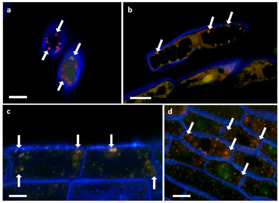 Images from the confocal microscopy on inoculated root cells are shown in Figure 12. The presence of intact P3AW:mCherry inside the borders of the cell walls of sloughed-off root cap cells (Figure 12a,b), epidermal cells (Figure 12c), and sclerenchyma cells (Figure 12d) shows that P3AW:mCherry becomes endophytic inside of clover roots and can enter clover root cells. Their exact position within the root cells is harder to distinguish, as the cell membrane was not stained. In root cap and epidermal cells, it appears that P3AW:mCherry is found close to the cell wall (Figure 12a–c), while in sclerenchyma cells, it appears that P3AW:mCherry is found around the nucleus or the central vacuole (Figure 12d). Three-dimensional confocal videos of root cap cells (Videos S1 and S2) appear to confirm that P3AW:mCherry is found in the cell periphery.