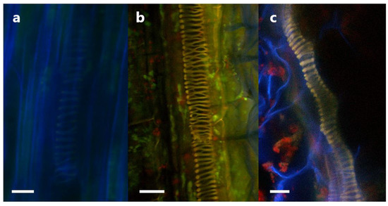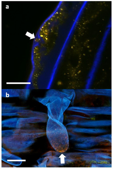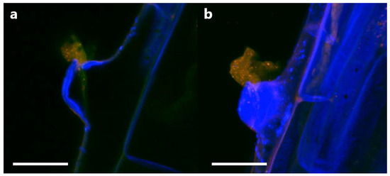 In uninoculated roots, very faint emissions could be detected in the high-wavelength red spectrum (Figure 11c), while in the inoculated roots, strong emissions could be detected in the red spectrum (Figure 11g). The relatively low level of red spectrum emissions in the uninoculated roots compared to the high level of emissions in the inoculated roots suggests that there is little to no red autofluorescence within clover root tissues. The overlap in green and red emissions between Figure 11b,c suggests that some small amount of red emissions in clover root tissue is due to spectral crosstalk.