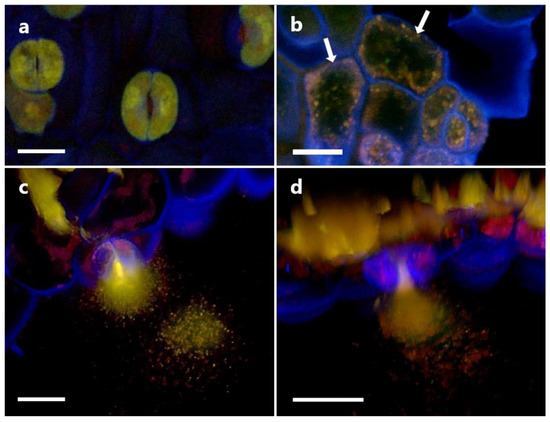 The combined channel images of the uninoculated root tissue (Figure 11d) shows no orange or gold areas indicative of true overlap between the green spectrum of SYTO13 and the red spectrum of mCherry, indicating no areas where DNA and mCherry are expressed simultaneously. Meanwhile, the P3AW:mCherry-inoculated roots (Figure 11h) shows much overlap between the green and red spectra, indicating that there are several areas where DNA and mCherry overlap. The presence of such an overlap can be contributed to intact P3AW:mCherry or the simultaneous existence of free-floating DNA and mCherry. The lack of overlap in uninoculated tissues combined with the presence of an overlap in the inoculated tissues shows that the triple-staining system is valid for the detection of mCherry and P3AW:mCherry in clover roots.