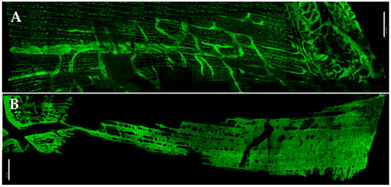 Confocal images of LYVE 1 stained mouse submesothelial lymphatic lacunae over the pleural (Panel (A)) and peritoneal (Panel (B)) sides of the diaphragm. A complex mesh of lymphatic vessels formed by confluent loops, linear vessels of variable sides equipped with lymphangions and thinner interfibrillar vessels are visible only in the pleural lymphatic side (A). On the peritoneal side, lymphatics are instead organized in large, flattened lacy-ladder shaped membranous structures (LLS). Bars: 300 µm.