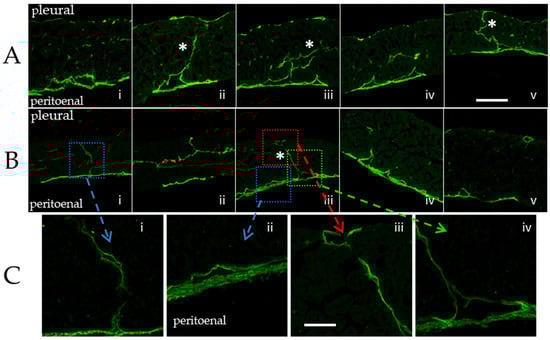 Panels (A,B). Low magnification confocal images of LYVE 1 stained mouse diaphragm. The pleural and peritoneal sides of the diaphragm (top and the bottom of panels (A) i–v may be connected by pleuro-peritoneal lymphatic vessels (asterisks). A different mouse cross section is shown in the image sequence (B) i–iv whose details are enlarged in panels (C) i–iv. Bar: 150 µm. Bar: 100 µm.