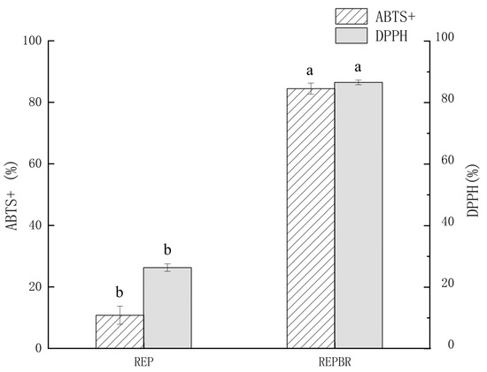 DPPH and ABTS+ radical scavenging efficiency of REP and REPBR. Different superscript letters are significantly different (p < 0.05).