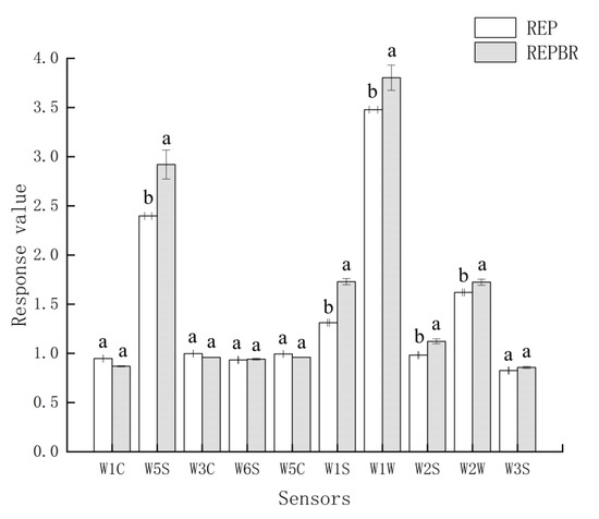 Electronic nose bar graph of REP and REPBR. Different superscript letters are significantly different (p < 0.05).