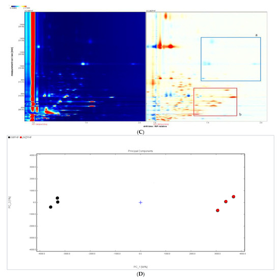 Flavor is one of the most important characteristics of rice processing. The changes in volatile components of indica rice flour during extrusion processing after adding blueberry residue powder were studied by GC—IMS. Figure 3A showed the three−dimensional map of REP and REPBR. It intuitively showed the differences of VOCs in different samples. However, due to the inconvenience of observation, the difference comparison was made in the vertical view, and the results were shown in Figure 3B. The background of the whole figure was blue. The ordinate represented the retention time (s) of gas chromatography, and the abscissa represented the ion migration time. The red vertical line at the abscissa 1.0 was the reactive ion peak (RIP, normalized), and each point on both sides of the rip peak represented a volatile organic compound. The substance concentration of VOCs could be expressed by color. The darker the color, the greater the concentration [32]. White indicates low concentration and red indicates high concentration. In addition, a difference comparison model was also carried out to illustrate the different VOCs between the REP and the REPBR, as shown in Figure 3C. The spectrum of the REPBR was obtained by deducting the reference spectral background (the REP was used as a reference). The blue dot area indicated that the substance was lower than that of the REP in this sample, as shown in area a in the figure. The red area indicates that the substance was more than the REP in this sample, as shown in area b in the figure. It was obvious that after the addition of blueberry residue to the indica rice flour and extrusion processing, the VOCs content had changed significantly, which could also be supported by the PCA results determined by the signal intensity of the VOCs (Figure 3D). It was observed that under the same experimental conditions, the difference between the REP and the REPBR in the distribution map was obvious and there was no overlap, which meant that the VOCs of the REP and the REPBR were significantly different.