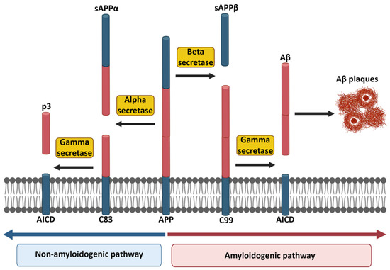 Non-amyloidogenic and amyloidogenic pathways in the cleavage of APP. The red part of APP indicates the potentially harmful Aβ portion, which appears at the end of the amyloidogenic pathway. Created partially with BioRender.com (accessed on 28 June 2021).