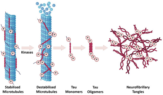 The progression of tau pathology in AD. In a healthy brain, tau is involved in regulation of microtubule stabilization. After tau hyperphosphorylation, microtubules are destabilized and start to disassemble. Tau monomers and oligomers subsequently occur intraneuronally and eventually formation of NFTs takes place. Created partially with BioRender.com (accessed on 28 June 2021).
