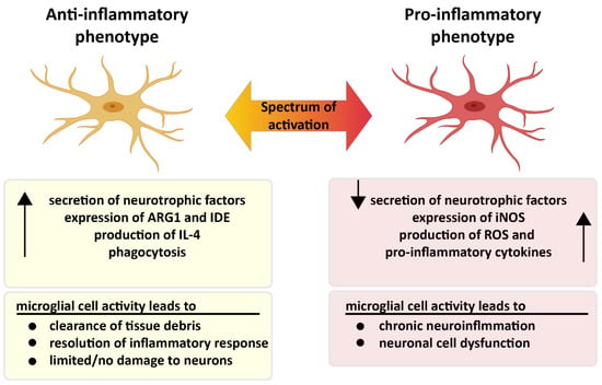 Two different faces of microglia. Pro- and anti-inflammatory microglia display different characteristics in the presence of microglial activation. While microglia are neuroprotective in the anti-inflammatory state, microglia in the pro-inflammatory condition trigger chronic inflammation, which leads to neuronal dysfunction. Created partially with BioRender.com (accessed on 28 June 2021).