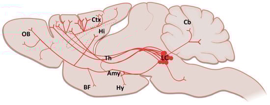 A sagittal schematic illustration showing the LC projections in the brain (Amy: Amygdala; BF: Basal Forebrain; Cb: Cerebellum; Ctx: Cortex; Hi: Hippocampus; Hy: Hypothalamus; LC: Locus Coeruleus; Th: Thalamus, OB: Olfactory Bulb). Created partially with BioRender.com (accessed on 28 June 2021).