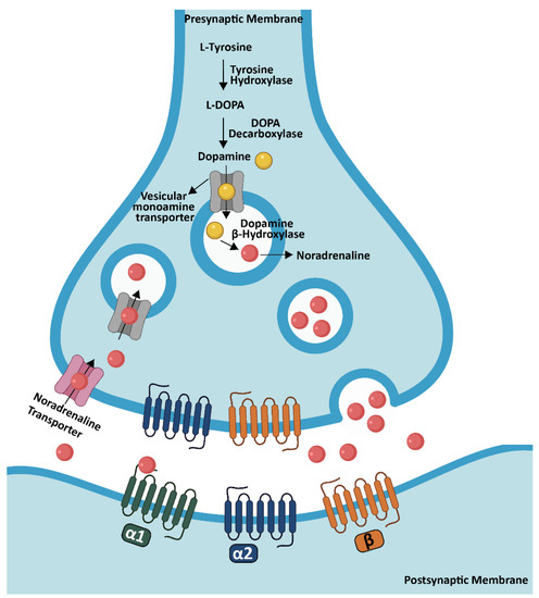 NA synthesis in the brain. NA synthesis is performed from dopamine through DBH in the LC and transported into synaptic vesicles by a vesicular monoamine transporter. After NA is released into the synaptic cleft, it binds to specific adrenergic receptors in order to activate the signaling for the specific task. Created partially with BioRender.com (accessed on 28 June 2021).