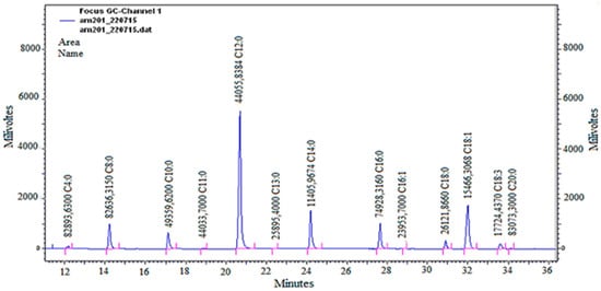 The major constituents identified in the oil were lauric acid (43.01%), myristic acid (11.10%), and palmitic acid (6.95%), three saturated fatty acids, and oleic acid (15.32%), a monounsaturated fatty acid (Figure 2). Oleic acid (20.13%), palmitic acid (23.21%), and myristic acid (2.14%) were also major constituents in the composition of the fixed oil of jackfruit [17]. These predominant fatty acids are common and important constituents in terms of biological activities for several other fixed oils [6,8].