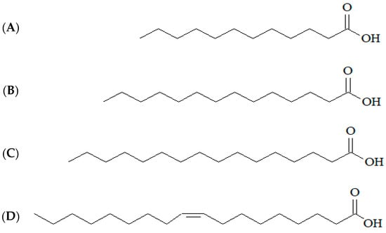 Figure 2. Main constituents identified in the fixed oil of the almond of A. heterophyllus and its structural representation: (A) lauric acid, (B) myristic acid, (C) palmitic acid, and (D) oleic acid.