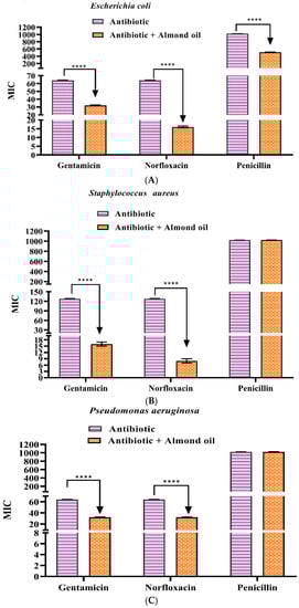 Figure 3. Potentiation of antibiotic action by the fixed oil of the A. almond against the analyzed strains: Escherichia coli EC–06 (A), Staphyloccus aureus SA–10 (B), and Pseudomonas aeruginosa PA–24 (C). Values are expressed as geometric mean ± mean standard error (SEM). Two-way ANOVA followed by the Bonferroni test was used. **** p < 0.0001, antibiotic alone vs. combined MIC.