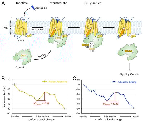 (A) Schematic description of β2AR structure and activation pathway. β2AR is shown in yellow, and its TM6 is in orange. The adrenaline is shown as a flash in blue. The G protein is shown in light green. (B) The energy landscape of the conformational change of β2AR without adrenaline binding. (C) The energy landscape of the conformational change of β2AR with adrenaline binding to each conformation.