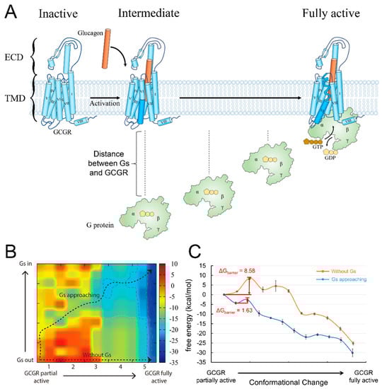 G protein engagement is proposed to help overcome the energy barrier []. To investigate this, we calculated the energy barrier for the conformational change in GCGR from the partially active state to the fully active state with or without Gs approaching. The conformation of GCGR in the partially active state came from the crystal structure of the receptor–partially active agonist complex (PDB ID: 5YQZ) []. In addition, the fully active GCGR conformation was obtained from the Cryo-EM structure of a GCGR-Gs complex activated by a full agonist (PDB ID: 6WPW) []. When the Gs protein was far away from the receptor, the energy barrier of the conformational change of GCGR was 8.58 kcal/mol (Figure 2C), which was consistent with the kink formation of TM6. To model the effect of the G protein’s approach on the energy barrier, we pulled Gs away from its binding site to different distances from GCGR, thus constructing a two-dimensional (2D) energy map by coupling the Gs distance and the GCGR conformational change (Figure 2B). As a result, we found a pathway from the partially active GCGR with the non-bound Gs (bottom left of the 2D map, Gs protein is far away from GCGR) to the fully active GCGR-Gs complex (top right of the 2D map, Gs has formed a complex with GCGR). The pathway describes the process through which Gs gradually approaches GCGR and eventually binds to the receptor. It has a lower energy barrier, 1.63 kcal/mol, than the barrier of GCGR activation without the Gs protein approaching (Figure 2C). The result indicates that the G protein approach indeed promotes GCGR activation.