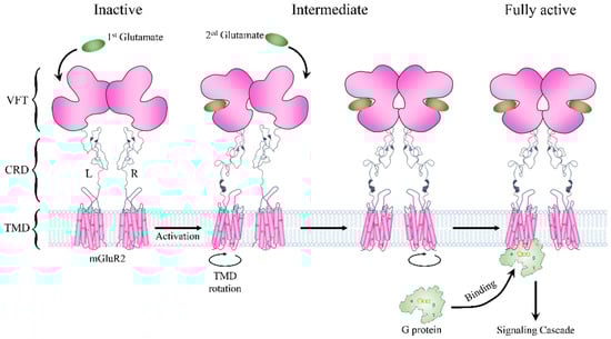 The metabotropic glutamate receptors (mGluRs) are archetypal class C GPCRs containing eight members (mGluR1-8) []. Like other GPCRs, mGluRs contain TMDs consisting of seven helices. Their distinctive structural features are the large ECD, consisting of a Venus fly trap (VFT) part and a cysteine-rich domain (CRD), and an obligated constitutive dimer for receptor activation (Figure 3) []. A VFT domain consists of two lobes that sit one atop the other, and agonists bind in a cleft between them (Figure 3) []. In the absence of glutamate, the mGluR2 dimer remains in an inactivate state that involves an asymmetric interface. The VFD domains of the receptor adopt an open conformation. Once the glutamate binds to the VFT domain, it can induce a substantial compaction of the receptor dimer, and the VFT and the CRD domain move close to their counterparts in the other subunit. Then, signals are delivered to the TMDs, leading to the rotation of the two TMDs and generating a dimer interface along with helix VI (Figure 3) [,]. Two glutamate signal molecules are required for the full activity of an mGluR dimer. Moreover, to facilitate G-protein coupling, the TMDs undergo a further movement to introduce an asymmetric dimer interface. However, only one TMD is responsible for G-protein binding, which suggests an asymmetric signal transduction mode in mGluRs (Figure 3) [,]. The structural basis of the mode is that the simultaneous activation of both TMDs in the dimer and the binding of two G proteins would result in a severe clash []. However, currently, it is not clear which TMD would bind to the G protein and transmit the signal. Considering that mGluRs are widely expressed in neurons and astrocytes and are responsible for neural signaling [], the asymmetric activation mode may originate from the need to verify input signals, thus avoiding the abnormal activation of neuronal cells.