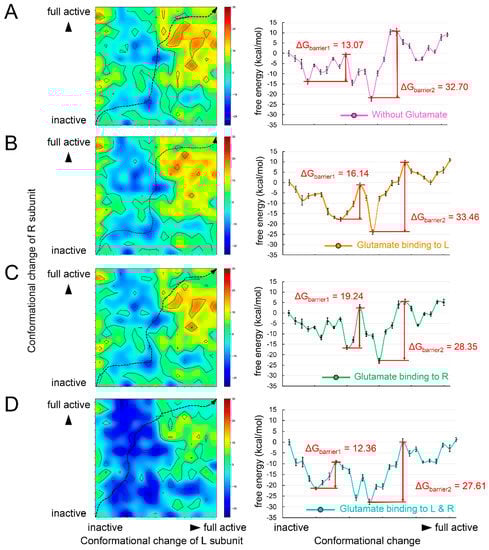 In order to validate the energy mechanism of the asymmetric activation of mGluRs, we constructed structural dynamics models from an inactive state to a fully active state using mGluR2 as an example. The structure of mGluR2 in an inactive state and a fully active state were extracted from recent Cryo-EM structures (PDB ID: 7EPA [] and 7E9G []). From the inactive state to the fully active state, the most obvious conformational change was the dimerization mode of the two TMDs: the main interaction in inactive mGluR2 was between helix III, and in fully active mGluR2 it was between helix VI []. The dimerization mode change implies that the TMDs undergo conformational rotations during the activation process and consequently lead to collisions between TMDs. Therefore, the conformational changes of the two subunits form a coupled relationship instead of occurring synchronously. We obtained the conformational change trajectory and picked 17 conformations (15 intermediates and 2 end points) at equal intervals for each subunit. By combining the conformations of the two subunits, we constructed a two-dimensional conformational change system (Figure 4). Each point in the system represents a possible conformational state during mGluR2 activation. We calculated the folding free energy of each point and then identified the least energy pathway from the inactive state to the fully active state (Figure 4A). The energy landscape of the pathway is shown in the right panel of Figure 4A. The point with the lowest energy may correspond to a stable intermediate conformation. On each side of this point, we found an energy barrier, ΔGbarrier1 and ΔGbarrier2 (Figure 4A). The result suggests that mGluR2 activation may be stepwise, consistent with the speculation of previous experiments [].