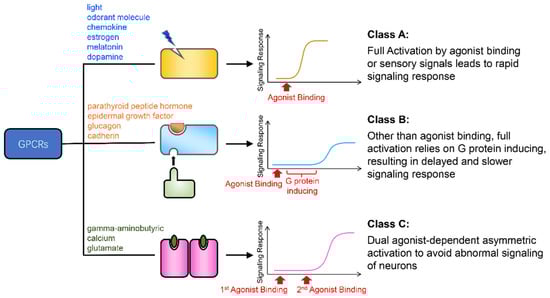 All GPCRs share a transmembrane domain (TMD) with a common structural architecture and present similar conformational changes during activation. The TMD consists of a bundle of seven α-helices that are embedded in the cell membrane and linked by intracellular and extracellular loops [,]. The signaling ligands (agonists) bind to the extracellular binding site and favor structural changes that allow G proteins or other signaling proteins to bind to the intracellular surface []. One hallmark of GPCR activation is the outward movement of the cytoplasmic end of transmembrane domain 6 (TM6), which opens an intracellular cavity to accommodate the Gα subunit, leading to nucleotide exchange and the activation of the G protein []. Beyond the similarity, GPCR structures also have diversity between different classes. GPCRs can be grouped into six classes (classes A–F) based on sequence homology and functional similarity [,]. They have their own structural characteristics, such as the additional eighth helix at the C terminal of class A, the larger extracellular domain of class B, and the multiple structural domains of class C [,]. These structural differences also affect the dynamic process of GPCR activation.