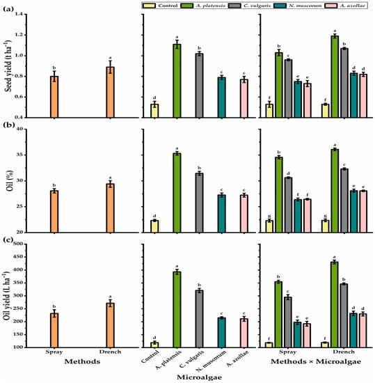 Seed yield ha −1 (t) (a), oil %−1 (b), and oil yield ha−1 (L) (c) of chia plants cultivated under alkaline stress conditions in response to different application methods, microalgae strains, and their interaction. The bars with different letters are significantly different at p ≤ 0.05 by DMRT. Mean values are presented as mean ± standard error.