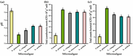 In this study, all microalgae applications caused an increase in the bacteria and cyanobacteria count and significantly reduced the pH levels in the experimental soil (Figure 3). This may be due to a rise in the number of microorganisms in the rhizosphere [100] and their impacts on the quantity of organic materials in microbial biomass [101], as well as microbial byproducts that contain extracellular polysaccharides and cell wall fragments [102]. Additionally, the application of microalgae improved soil biological activity since microalgae are a continuously replenishing source of carbon [103]. Kapil et al. [104] stated that cyanobacteria application is a significant strategy in bioremediation of alkaline soil as it declines the soil pH from 9.2 to 7.5. Among all microalgae applications, C. vulgaris showed the lowest cyanobacteria count, but with a significant increase relative to untreated soil. That may be due to their vital role in decreasing the soil pH (Figure 2), as generally, cyanobacteria prefer neutral pH for optimum growth and establishment [105].