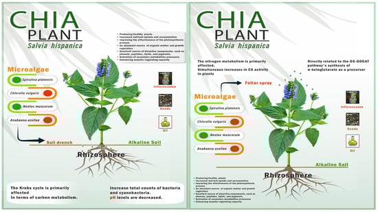 The mechanisms of foliar spray and soil drenching with microalgae supplementation on chia plants cultivated under alkaline stress conditions.