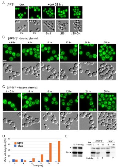 Earlier work by others shows the amount of Sis1 in doxycycline-treated cultures drops below detection by 18 generations, yet cultured cells continue to grow for over a hundred generations and to propagate [PSI+] stably for 30 generations []. As Sis1 is essential for viability [], trace amounts of Sis1 are enough to support cell growth and [PSI+] propagation, and presumably to protect from [PSI+] toxicity. To confirm effectiveness of doxycycline repression of Sis1 expression in our hands, we monitored abundance of Sis1 by Western blot (Figure 3E). Exposure to doxycycline for 28 h reduced the amount of Sis1 to less than 3% of that of untreated cells, which is comparable to earlier data [,].