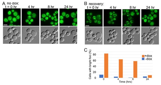 Strain 2140 log phase cells were grown in SC medium selecting for plasmids and fixed via paraformaldehyde (http://mcb.berkeley.edu/labs/koshland/Protocols/MICROSCOPY/gfpfix.html, accessed on 3 October 2022) before, and 28 h after 6 μg/mL of doxycycline was added. Control cells were grown similarly without doxycycline. Microscopic images were captured on a Nikon E-800 microscope using Nikon NIS Elements software (04.30.02 64 bit, Nikon Instruments Inc., New York, NY, USA) with a Q-Imaging Retiga EXi digital camera, Plan APO VC 60X oil immersion DIC optics, GFP and RFP filters. Images were processed for presentation using Adobe Photoshop 2022 software.