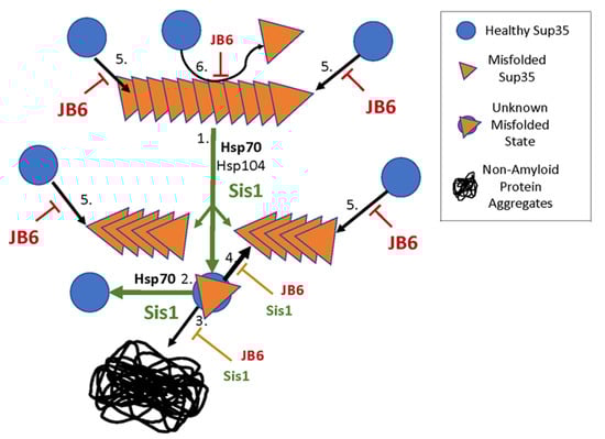 Possible ways that Sis1 and DnaJB6 (JB6) help keep Sup35 soluble in [PSI+]S cells. The blue circles represent properly folded Sup35. The orange triangles represent misfolded [PSI+]S Sup35. The stacked orange triangles represent Sup35 prion amyloid sheets that grows by adding Sup35 monomer to its ends and converting them to amyloid as they join the fiber (arrows 5). Green arrows show our proposed primary function of Sis1, which is to cooperate with Hsp70 and Hsp104 extract Sup35 monomers out of the amyloid sheet thereby dividing it into two smaller amyloids (arrow 1) that can continue to grow. The extracted protein represented by the overlapped circle and triangle is in an unknown misfolded state that has three different fates as shown by arrows 2–4. Sis1 with Hsp70 could refold Sup35 to its native conformation (arrow 2). The misfolded protein could aggregate in a non-amyloid manner (arrow 3), or the protein could re-join the amyloid, perhaps more readily than native Sup35 (thicker arrow 4). By promoting refolding (arrow 2), Sis1 would reduce arrows 3 and 4. Sup35 is capable of binding to the ends of prion amyloid at any point (arrows 5). Sup35 likely interacts with the surfaces of the amyloid, where secondary nucleation might also occur (arrow 6). We propose DnaJB6 (JB6) mainly acts by inhibiting arrows 3–6 via binding directly to the amyloid or aggregate, thus sterically hindering its interaction with native Sup35. Sis1 needs to interact with Hsp70 to help keep Sup35 soluble, so we suspect it mainly acts through arrows 1 and 2.