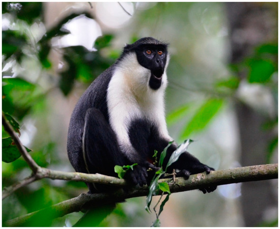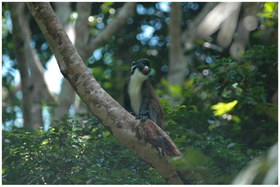 Three guenon species ranging within Côte d’Ivoire’s Taï Forest, Diana monkeys (Cercopithecus diana, Figure 1), Campbell’s monkeys (C. campbelli, Figure 2), and Lesser spot-nosed monkeys (C. petaurista, Figure 3), frequently form mixed-species associations, primarily as an anti-predation mechanism against chimpanzees, leopards, and crowned eagles [1,2,3,4,5,6,7,8,9].