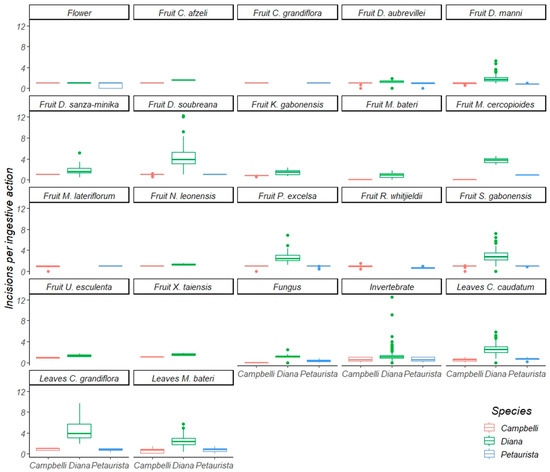 Between April 2016 and December 2018, we quantified oral-processing activity across the three guenon taxa during a total of 2316 focal periods. This includes 288 focal periods of Campbell’s monkeys, 1838 focal periods of Diana monkeys, and 182 focal periods of Lesser spot-nosed guenons (Table 2). During this period, we collected focal observations of Campbell’s monkeys eating sixteen fruit species, two young and three mature leaf species, invertebrates, fungi, and seeds. Diana monkeys were observed eating 14 fruit species, four young leaf species, two mature leaf species, invertebrates, fungi, flowers, and leaf petioles. Lesser spot-nosed guenons were observed eating nine fruit species, four mature leaf species, two young leaf species, invertebrates, flowers, fungi, and one seed species. We emphasize that the total dietary breadth of these species is greater than that reported here [10,23], and that this study is restricted to those foods consumed by two or more species (Table 3), which represents a subset of the larger dataset (Supplemental Table S1). We were able to statistically compare consumption of 13 fruit species, 5 leaf species, invertebrates, fungi, and flowers (Table 4) in terms of their incisions (Figure 4) and post-canine chews (Figure 5) per ingestive action. We did not statistically examine the role of inter-individual variability due to constraints of sample size (Supplemental Figures S1 and S2).