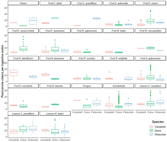 A boxplot of postcanine chews per ingestive action of Diana monkeys, Campbell’s monkeys, and Lesser spot-nosed monkeys while eating the same food items during this study. The line inside each box represents the median; whiskers represent the 25 and 75 percentiles.
