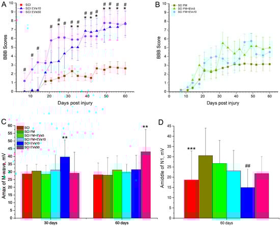 (A,B) Results of functional tests on the “BBB” scale in scores (Y axis), from 7 to 60 days after SCI in the experimental groups (X axis). # p < 0.05—SCI compared to SCI EVs50; * p < 0.05—SCI compared to SCI EVs10. (C) Results of the evaluation of the amplitude of M-waves (Y axis) at 30 and 60 days after SCI in the experimental groups (X axis). ** p < 0.05 compared to all groups. (D) The middle of lumbar N1 (Y axis) after SCI in the experimental groups (X axis) at 60 days. *** p < 0.05—SCI compared to SCI FM and SCI FM+EVs5; ## p < 0.05—SCI EVs10 compared to SCI FM, SCI FM+EVs5 and SCI FM+EVs10.