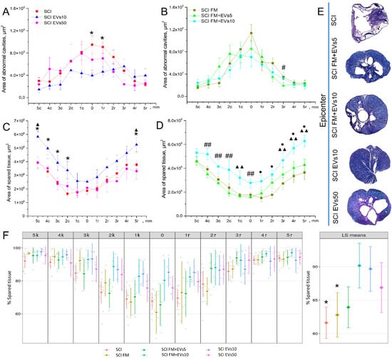 Results of morphometric analysis with evaluation of (A,B) total area of pathological cavities and (C,D) area of preserved tissue of the spinal cords of rats of the experimental groups at 5 mm in the rostral and caudal direction (X axis) at 60 days from the SCI epicenter. * p < 0.05—SCI compared to SCI EVs10; # p < 0.05—SCI FM compared to SCI FM+EVs5; ## p < 0.05—SCI FM+EVs5 compared to SCI FM+EVs10; ▲ p < 0.05—SCI EVs50 compared to SCI EVs10; ▲▲ p < 0.05—SCI FM+EVs10 compared to SCI FM and SCI FM+EVs5; ● p < 0.05—SCI FM compared to SCI FM+EVs10. (E) Cross-sections of the injured spinal cord at 60 days after SCI in experimental groups at the injury epicenter. Azur–eosin staining. (F) Left—Group means (with 95% t CIs) of preserved gray matter after SCI at different distances from the injury locus. Gray dots represent raw data. Right—Group least square means marginalized over the distance from the injury locus (with 95% t confidence intervals). * p < 0.05—comparing SCI FM+EVs10 and SCI EVs10.