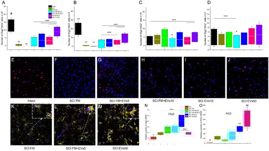 (A–D) Number of Olig2+/NG2- and Olig2+/NG2+ cells (Y axis) in control and experimental animal groups at 60 days after SCI. * p < 0.05—as compared with SCI FM+EVs10, SCI EVs10 and SCI EVs50; ** p < 0.05—as compared with all groups; # p < 0.05—as compared with SCI FM, SCI FM+EVs5, SCI FM+EVs10 and SCI EVs10; *** p < 0.05. (E–J) Panels illustrate Olig2+/NG2−-cells in intact rats (E), Olig2+/NG2−-cells at day 60 after fibrin matrix application (F), MSCs-EVs within fibrin matrix (G,H) and intravenous infusion of MSCs-EVs in saline (I,J) in LF zone of spinal cord. (K–M) Panel illustrates Olig2+/NG2+-cells on day 60 after application of fibrin matrix (K), MSCs-EVs within fibrin matrix (L) and intravenous infusion of MSCs-EVs in saline (M). The zones highlighted with dashes correspond to each other, and the arrow points to the enlarged image of the corresponding zone. Arrows indicate Olig2+/NG2+-cells. Scale bar: 20 μm. (N,O) Relative quantity of Olig2 and NG2 mRNA expression at 60 days after SCI in experimental groups, calculated in relation to intact spinal cord controls, which were considered as 1. mRNA expression was normalized using 18s rRNA. * p < 0.05—as compared with SCI FM, SCI FM+EVs10, SCI EVs10 and SCI EVs50; ** p < 0.05—as compared with SCI FM and SCI FM+EVs5; # p < 0.05—as compared with SCI FM, SCI FM+EVs5 and SCI EVs10; ## p < 0.05—as compared with SCI, SCI FM and SCI FM+EVs5; *** p < 0.05.