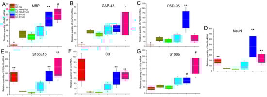Analysis of mRNA expression in the caudal area of SCI in experimental rats. (A–G) Relative quantity of expression of MBP, GAP43, PSD95, NeuN, s100b, S100a10 and C3 mRNA 60 days after SCI, calculated in relation to intact controls, which were considered 1. mRNA expression was normalized using 18s rRNA. * p < 0.05—as compared with all groups; ** p < 0.05—as compared to SCI FM and SCI FM+EVs5; # p < 0.05—as compared to SCI, SCI FM and SCI FM+EVs5.