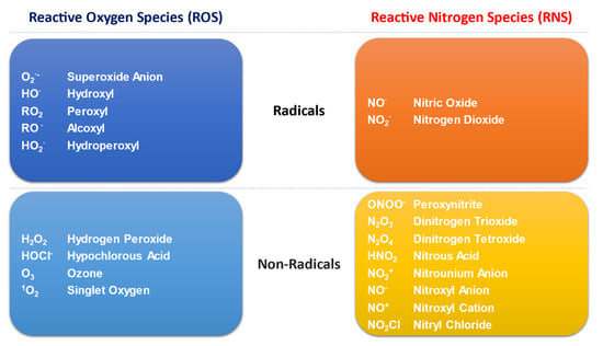 Major metabolic pathways and their breakdown products are required to meet the cellular energetic and synthetic demands, including the responses of immune cells. Metabolic reactions produce both reactive oxygen and nitrogen species (ROS and RNS, respectively), globally termed as reactive species or oxidants (Figure 1). Such molecules are classified as free radicals (with one or more unpaired electrons in their outer shell) and non-radical compounds. Free radicals comprise superoxide anion (O2·−) hydroxyl radical (HO·), nitric oxide (NO·) and nitrogen dioxide (NO2·), while hydrogen peroxide (H2O2), dinitrogen trioxide (N2O3) and peroxynitrite (ONOO−) are non-radical derivatives that may initiate free radical production [].