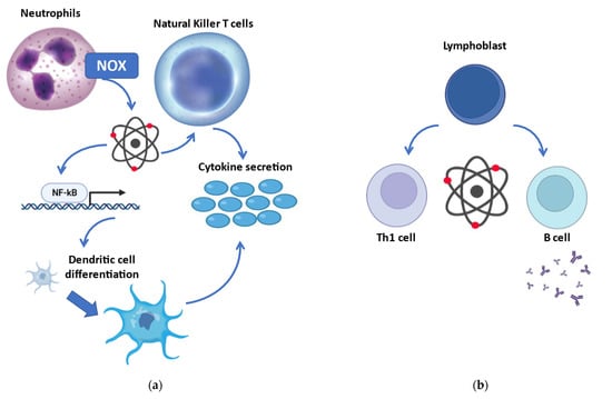 Redox signaling and regulation are crucial in adaptive immunity (Figure 2b). Indeed, excessive production of reactive species is associated with the activation and differentiation of both T and B cells. T helper activation, required for both humoral and cell-mediated immune response, relies on the redox status of the microenvironment []. Even though a reduced microenvironment could protect from oxidative stress during T cell activation, mild concentrations of reactive species are necessary for the initiation of adaptive immune response []. Activation of CD28, costimulatory of T cell activation, induces intracellular reactive species, with consequent induction of IL-2 via NF-κB []. On the other hand, the antioxidant GSH is required to regulate the proliferation of activated T cells []. Nevertheless, low amounts of reactive species are a precondition for T cell survival, while oxidant accumulation causes apoptosis/necrosis []. Moreover, redox signaling may affect T cell commitment, and different T cells present with various redox levels []. Indeed, oxidative status induces Th1 development, while prevalence of reducing molecules shifts toward Th2 responses [].