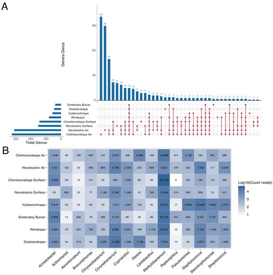 Common and unique bacterial genera according to two independent parts of the research. (A) An UpSet plot illustrates the common and unique microbial genera at the stations of the Moscow subway. The number on the left indicates the total number of genera in the sample, and the number above the bar indicates the number of unique/common genera for groups marked below the bars. (B) Heat map illustrates the representation of the 15 most common genera at all six stations. The numbers indicate the number of reads.