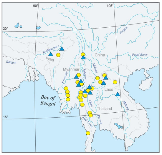- Kottelat, M.; Baird, I.G.; Kullander, S.O.; Ng, H.H.; Parenti, L.R.; Rainboth, W.J.; Vidthayanon, C. The status and distribution of freshwater fishes of Indo-Burma. In The Status and Distribution of Freshwater Biodiversity in Indo-Burma; Chapter 3; Allen, D.J., Darwall, W.R.T., Smith, K.G., Eds.; IUCN: Cambridge, UK; Gland, Switzerland, 2012; pp. 50–77. [Google Scholar]