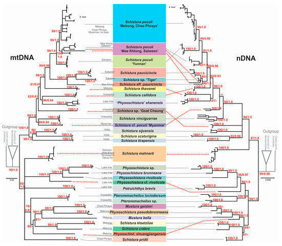 Maximum likelihood trees of the loach species around Schistura poculi based on two mitochondrial (left) and three nuclear (right) markers. Support values at the nodes are ML/BI values. Nodes with support <75 and intraspecific support values are not shown. Cases of conflict are indicated by dotted red lines.