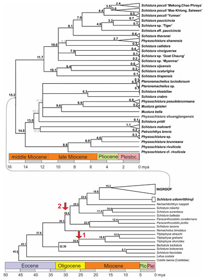 According to our results, the origin of the poculi species group (corresponding to its divergence from the Physoschistura species group) dates to about 15 mya and although we did not carry out a full biogeographic analysis, a clear biogeographic trend is visible (Figure 8): the oldest split within the group was dated to about 11–12 mya and separates the three species from north India (S. tirapensis, S. sijuensis, and S. scaturigina) from the remaining species, which all originated from localities east from India. The next younger phylogenetic events about 10 mya led to four lineages; three lineages collect all species from Myanmar (Schistura sp. ‘Myanmar’, Schistura sp. ‘Goat Chaung’, S. vinciguerrae, S. callidora, and P. shanensis), while the fourth lineage underwent another round of radiation at ~ 8 mya and afterward led to all species from Laos, China, and Thailand (S. thavonei, S. aff. Paucicincta, Schistura sp. ‘Tiger’, S. paucicincta, and three clades of S. poculi). We interpret this pattern as the result of an eastward expansion of the poculi species group during the second half of the Miocene from north India (Indian subregion according to Abbell et al. [71]) via Myanmar (Southeast Asian subregion, western Indochina province) into Laos (Southeast Asian subregion, Mekong province), western China (Southeast Asian subregion, Salween province), and western Thailand (Southeast Asian subregion, Salween province, and Thai Gulf province). Talking in biogeographic terms, the expansion crossed the border between the Indian and the Southeast Asian subregion, and within the later subregion led from the western Indochina province into the Mekong, Salween, and Thai Gulf provinces. Such massive range extension across the borders of provinces and even subregions is remarkable since it spans across the Arakan Mountains (including the Naga Hills, Chin Hills, Rakhine Yoma, and the Tenasserim Mountain Range including the Shan Plateau). These two north-south stretching mountain chains were uplifted by the lateral deformation of the Asian plate during the collision with the Indian plate [72] and are well-known biogeographic barriers for freshwater fauna (as found in sponges and Polychaeta [73], bivalve mussels [73,74] and fish [75,76,77,78]).