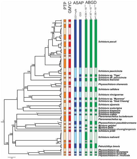 The ABGD species delimitation approach based on the COI dataset divided the individuals into 27, 29, and 31 groups (13 in the Schistura poculi group vs. 14–18 in the Physoschistura group), where the differences were only within the clades formed by S. mahnerti and Pteronemacheilus. The ABGD provided 3 different possibilities of grouping based on maximal distance prior (for maximal distance p = 0.001000 31 groups, for maximal distance p = 0.001668 and p = 0.002783 29 groups, for maximal distance p = 0.004642–p = 0.035938 27 groups). The ASAP approach provided very similar results as ABGD, the best partition divided the COI dataset into 27 groups (13 in the Schistura poculi group vs. 14 in the Physoschistura group) and the concatenated mtDNA dataset into 25 groups (11 in the Schistura poculi group vs. 14 in the Physoschistura group). The GMYC and bPTP approaches both divided the individuals into 45 groups (28 in the Schistura poculi group and 17 in the Physoschistura group). In the bPTP approach, no differences were present between the results of ML and BI solutions.